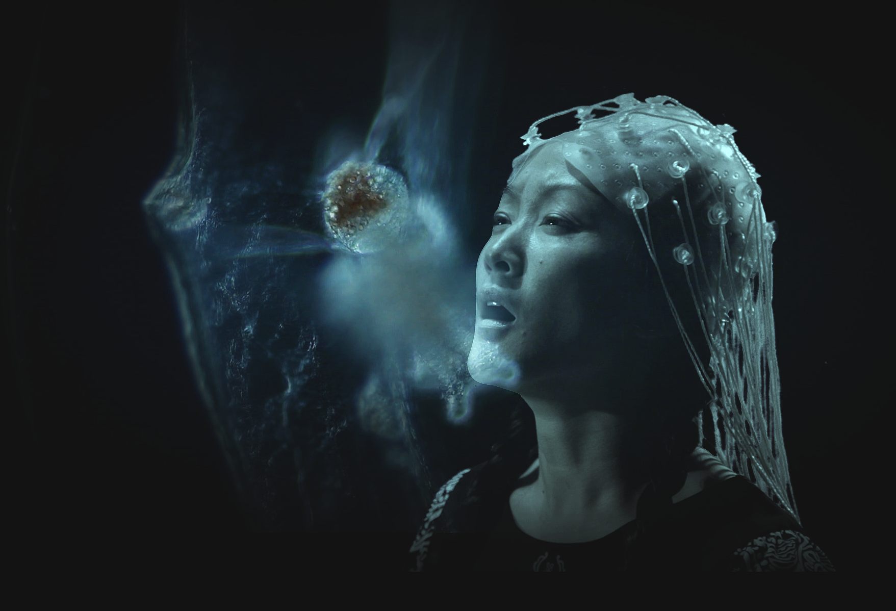 The Dark Glow is a piece that feels closer to slow moving photography than cinema. It is like an observation of the subtle effects of rain drops, pearl like particles, calligraphic silhouettes and states of beings viewed through some macro or ultra definition lens. They are visual tableaux of mysterious movements of inner and outer landscapes of outbreaks and tempest.