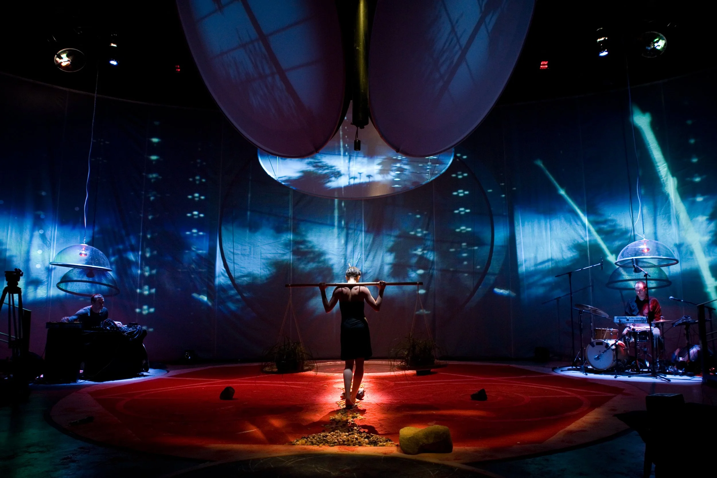 The Dynamic Constellations is an original interdisciplinary performance that weaves together live video mixing, choreographic presence, and multi-screen projection in a visually rich and spiritually resonant experience. At its core, the work is a constellation of impressions—fragments of travel, emotion, intuition, and cultural resonance—filtered through a poetic lens. Inspired by nomadic explorations in Brazil, Asia, and North America, the project uses dynamic editing and layered iconography to reflect on how we are drawn—sometimes inexplicably—to others, to places, to moments of transformation.