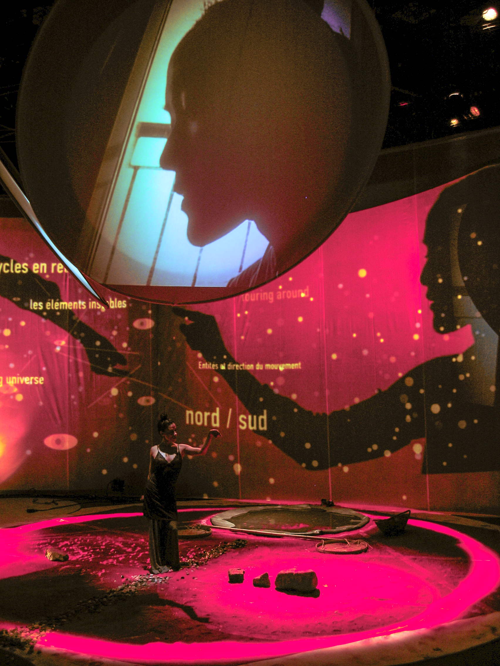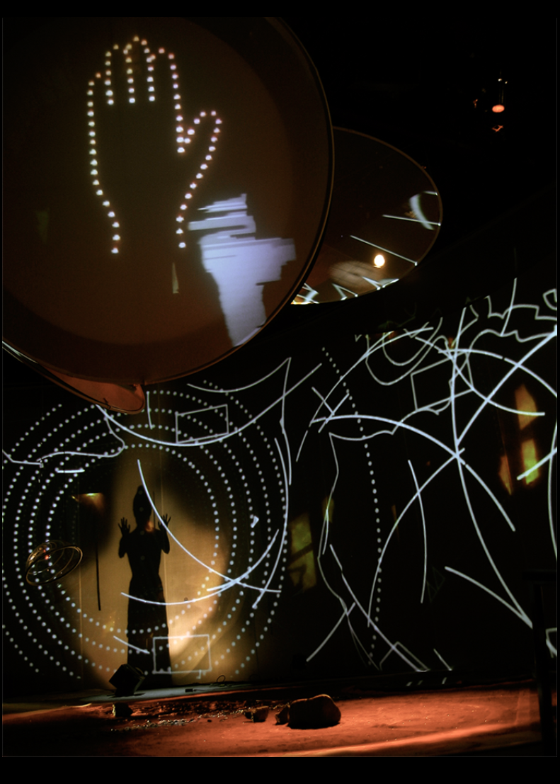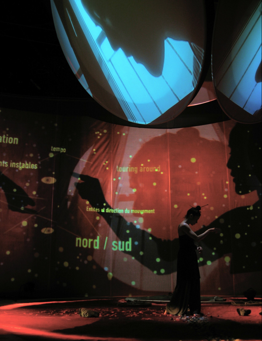 “The performance is first and foremost a ‘vibrational’ experience combining images, light, sound, and movement. The spectator encounters video projections on multiple screens and hears two musicians as well as a performer-choreographer who gives physical form to the rhythmic logic of the images unfolding around them. […] Contrary to what usually happens—where the video adapts to the music—here the musicians and the entire creative team give free rein to spontaneity and improvisation… starting from the images. This results in a fragmented narrative mode that can lead to suprising synchronicities. Often, one even encounters a kind of new language generated by free associations between elements and by the continuous play of improvisation. Something more real than real.’’
