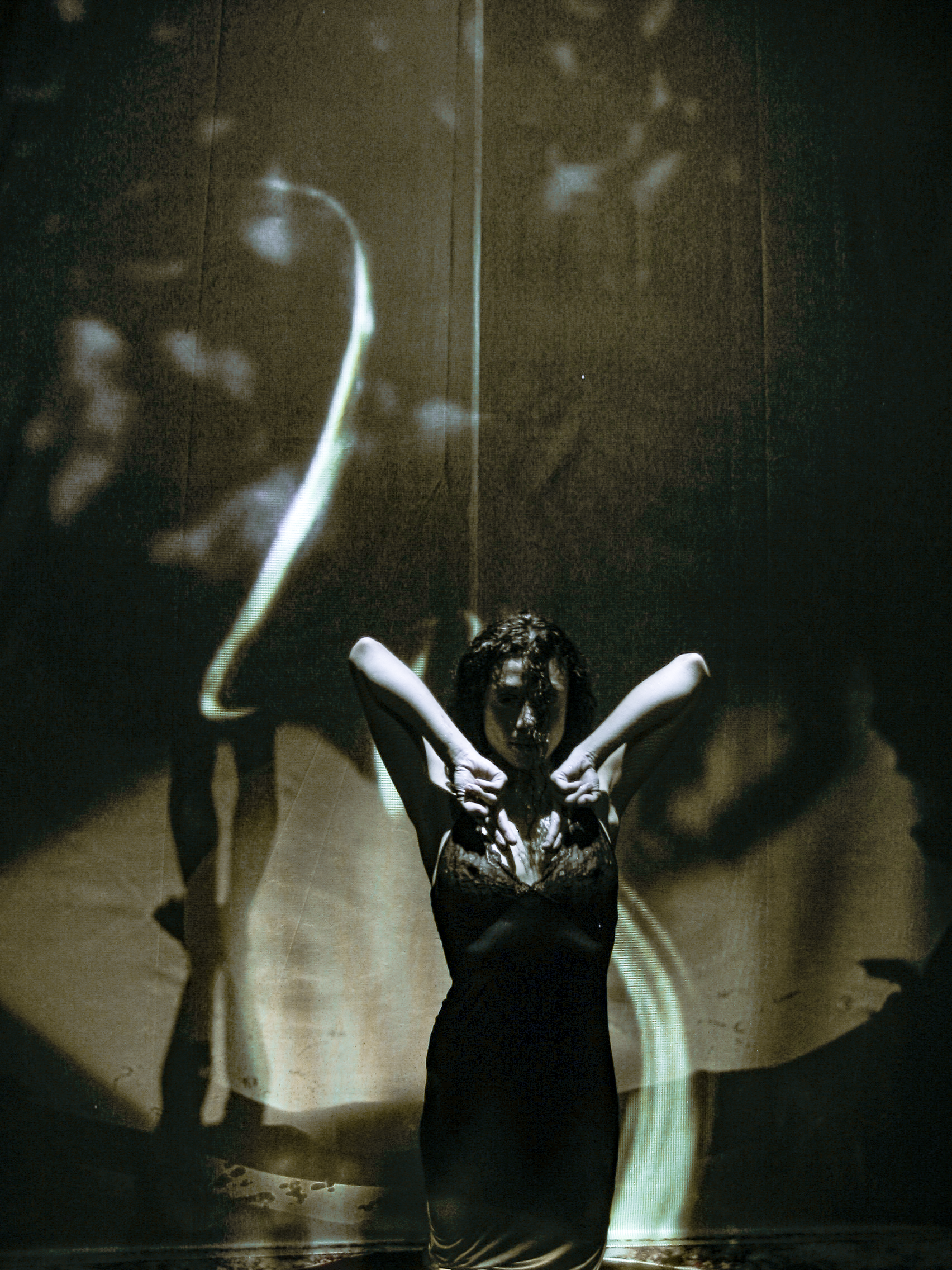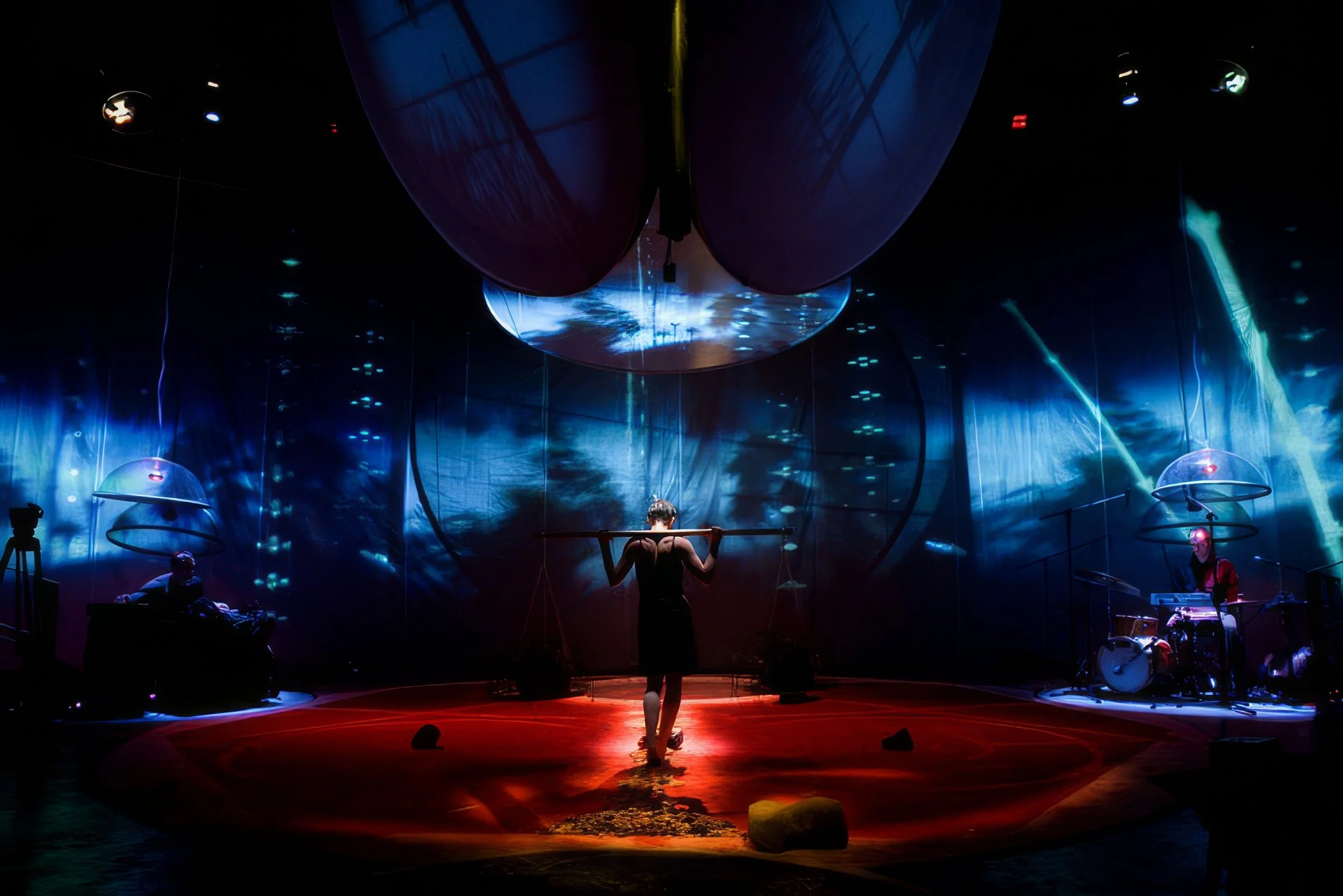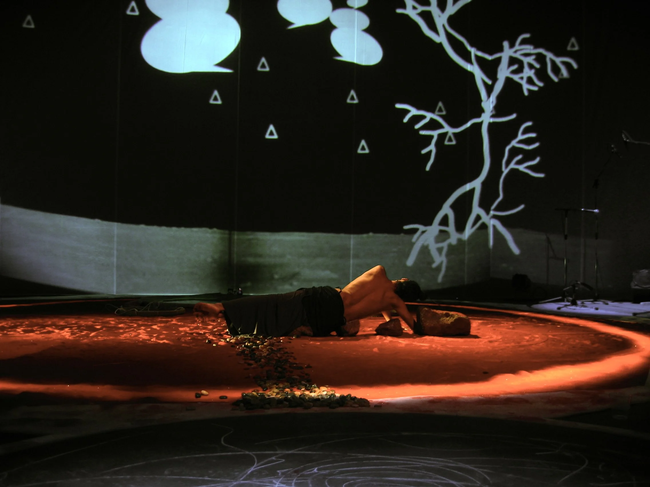 “The performance is first and foremost a ‘vibrational’ experience combining images, light, sound, and movement. The spectator encounters video projections on multiple screens and hears two musicians as well as a performer-choreographer who gives physical form to the rhythmic logic of the images unfolding around them. […] Contrary to what usually happens—where the video adapts to the music—here the musicians and the entire creative team give free rein to spontaneity and improvisation… starting from the images. This results in a fragmented narrative mode that can lead to suprising synchronicities. Often, one even encounters a kind of new language generated by free associations between elements and by the continuous play of improvisation. Something more real than real.’’