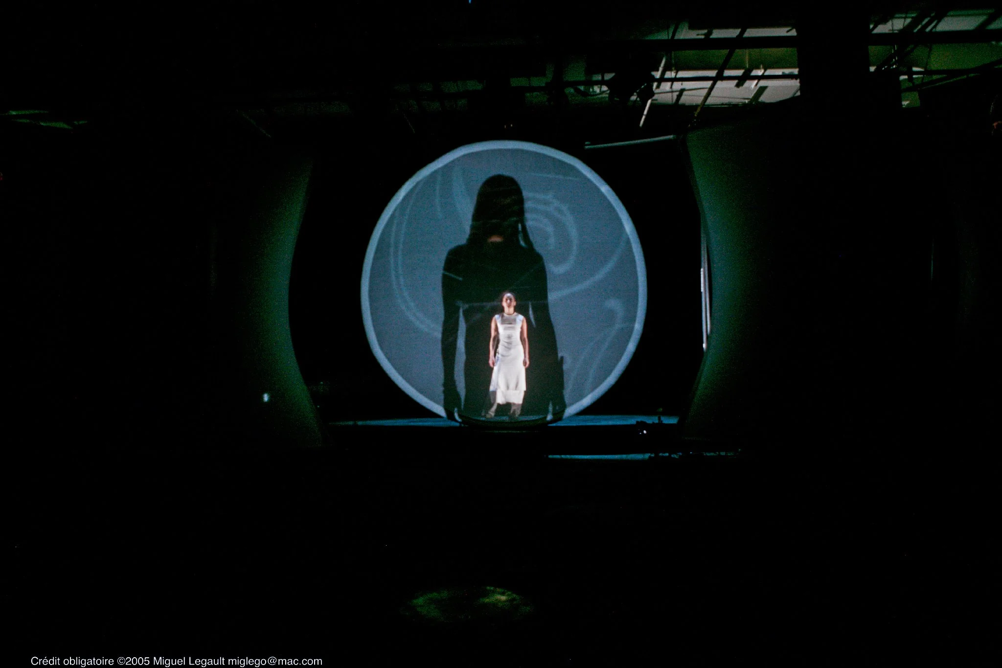 Acidic, industrial electronic sounds combined with 180° projections invite the audience to be carried away by the reflective perspective offered by this extraordinary collective. At its core is a dancer with a striking, disarticulated grace, moving at the center of a constellation symbolized by the screens, facing an audience that is both surprised and captivated by the dense, contemplative visual information of a VJing performance rich in ideas. This highly original show is sure to inspire both wonder and reflection, engaging the audience with numerous themes explored through this truly unique stage experience.