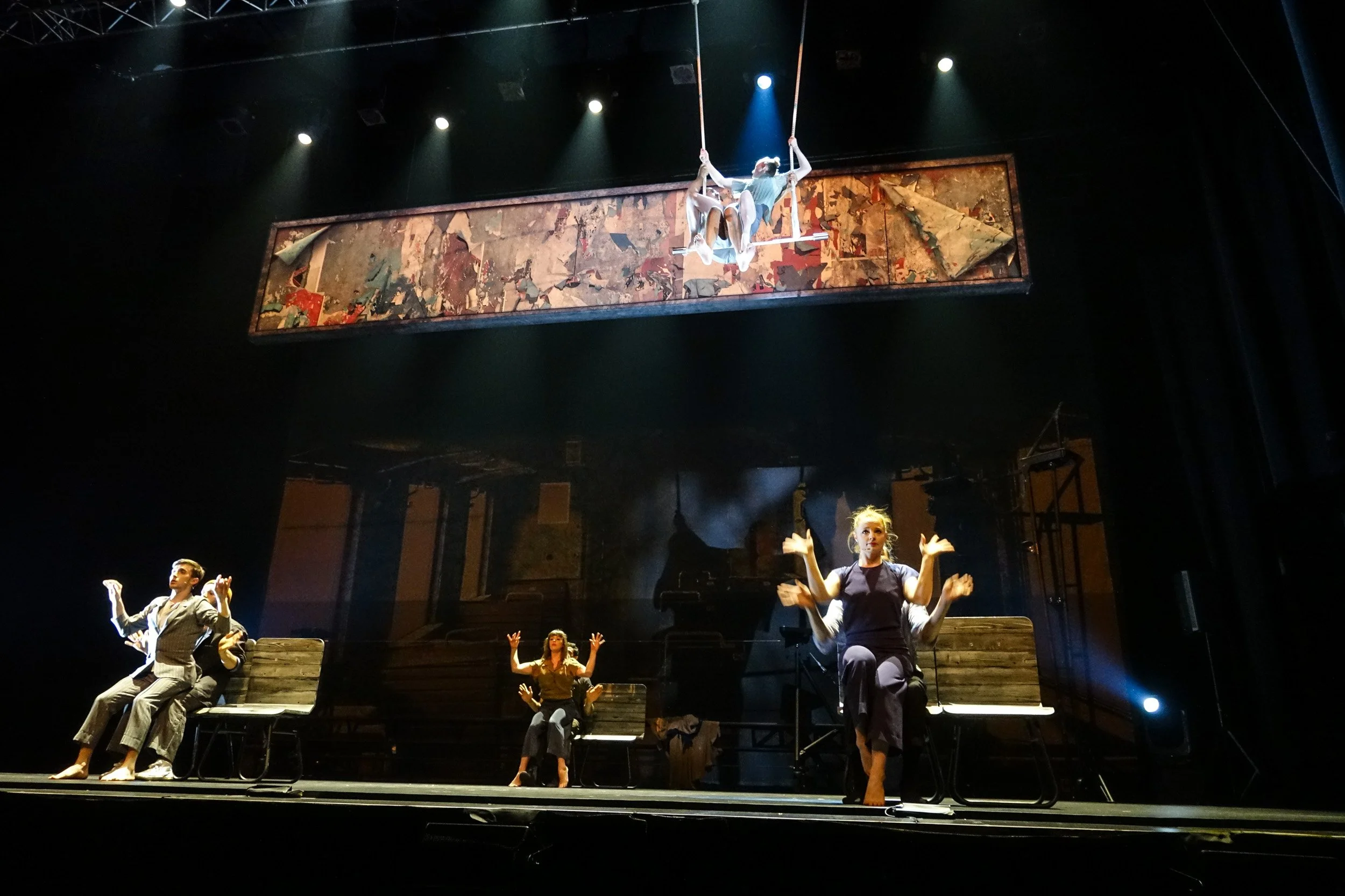 Les 7 doigts propels us through space and time alongside eight travelers. They engage in conversations—among other things, about the speed of light and the dilation of time, nothing less—while revealing their inner states or fragments of their personal histories, often in an introspective mode. The highly accomplished projections that punctuate the performance resonate with the actions, emotions, and sensations of its atmospheric and autofictional narrative.